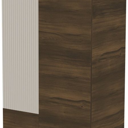 Kot del kolekcije Torin, omara izstopa zaradi odebeljenih stranic, kovinskih ročajev in žlebičaste letve v barvi hrasta venge magic. Ti detajli dodajajo trdnost in eleganco celotni zasnovi.
