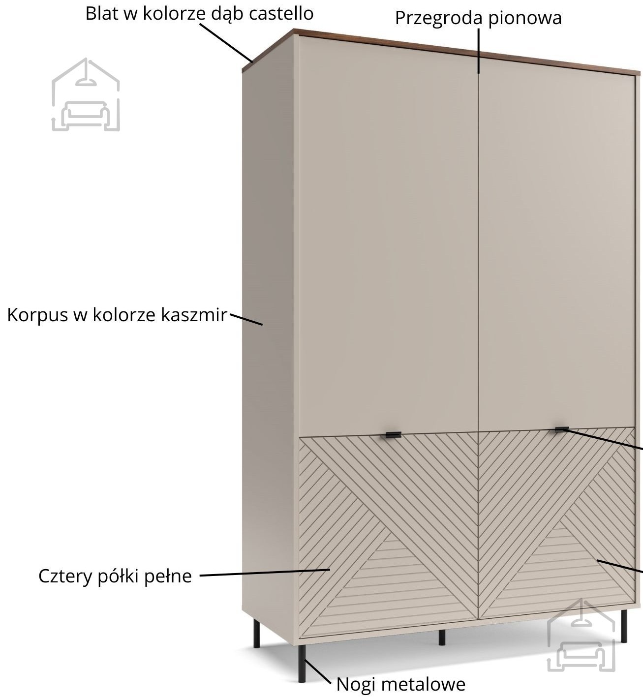 Omara je izdelana iz visokokakovostnega iverala, ki zagotavlja trpežnost in dolgo življenjsko dobo. Barvna kombinacija kašmirja in castello hrasta prinaša v vaš dom občutek topline in elegance. Ta barvna shema je skrbno izbrana, da se zlije z različnimi notranjimi dekoracijami, od klasičnih do modernih.