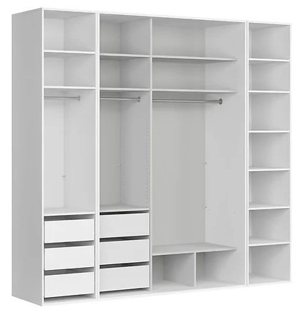 Moderna garderobna omara z impresivnimi merami 250,7×240×66 cm postane osrednji kos v elegantni spalnici ali garderobi. Opremljena je s 14 policami, vključno z 2 širokima, primernima za puloverje, puloverje ali hlače, 3 obešalniki za srajce, obleke in suknjiče, ter 6 predali za dodatke in spodnje perilo. Dodatno je opremljena s spodnjo polico s stojalom.