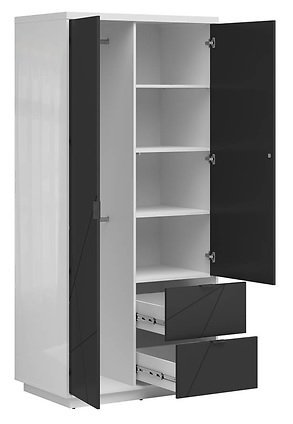 Garderobna omara Forn je odličen dodatek za shranjevanje v dnevni sobi ali pa služi kot element majhne garderobne omare v predsobi, spalnici ali otroški sobi. Njena funkcionalnost omogoča učinkovito organizacijo osebnih stvari. Notranjost omare je pametno razdeljena na več funkcionalnih con. Za obešanje oblačil, kot so srajce, jakne in obleke, so na voljo 2 praktična obešalnika. Preostale dele garderobe lahko razporedite na 4 police in v 2 priročna predala, kar omogoča urejeno shranjevanje. Garderobna omara s dimenzijami 94x200 cm je primerna za različne prostore. Tečaji z vgrajenim mehkim zapiranjem zagotavljajo, da se sprednja stran zapira enostavno in tiho, kar povečuje udobje uporabe. Vodila, ki omogočajo popoln izvlek predalov, dodatno prispevajo k enostavnosti uporabe omare. Obešalniki omogočajo, da ohranite obešene kose oblačil urejene, medtem ko police in predali ponujajo prostor za shranjevanje manjših predmetov ali tistih, ki jih želite imeti urejene in pri roki. Edinstven slog kolekcije Forn se poudarja s široko paleto barvnih možnosti. Omara je na voljo v 4 različicah: bela sijaj, temni delano hrast/ mat črna, temni delano hrast/beli sijaj, bela sijaj/mat črna. To vam omogoča, da izberete kombinacijo barv, ki najbolje izraža vaš osebni stil. Garderobna omara Forn združuje funkcionalnost, organizacijo in estetiko, kar ustvarja prostor za urejeno shranjevanje vaše garderobe v skladu z vašim okusom in potrebami. | Material: Iveral in MDF