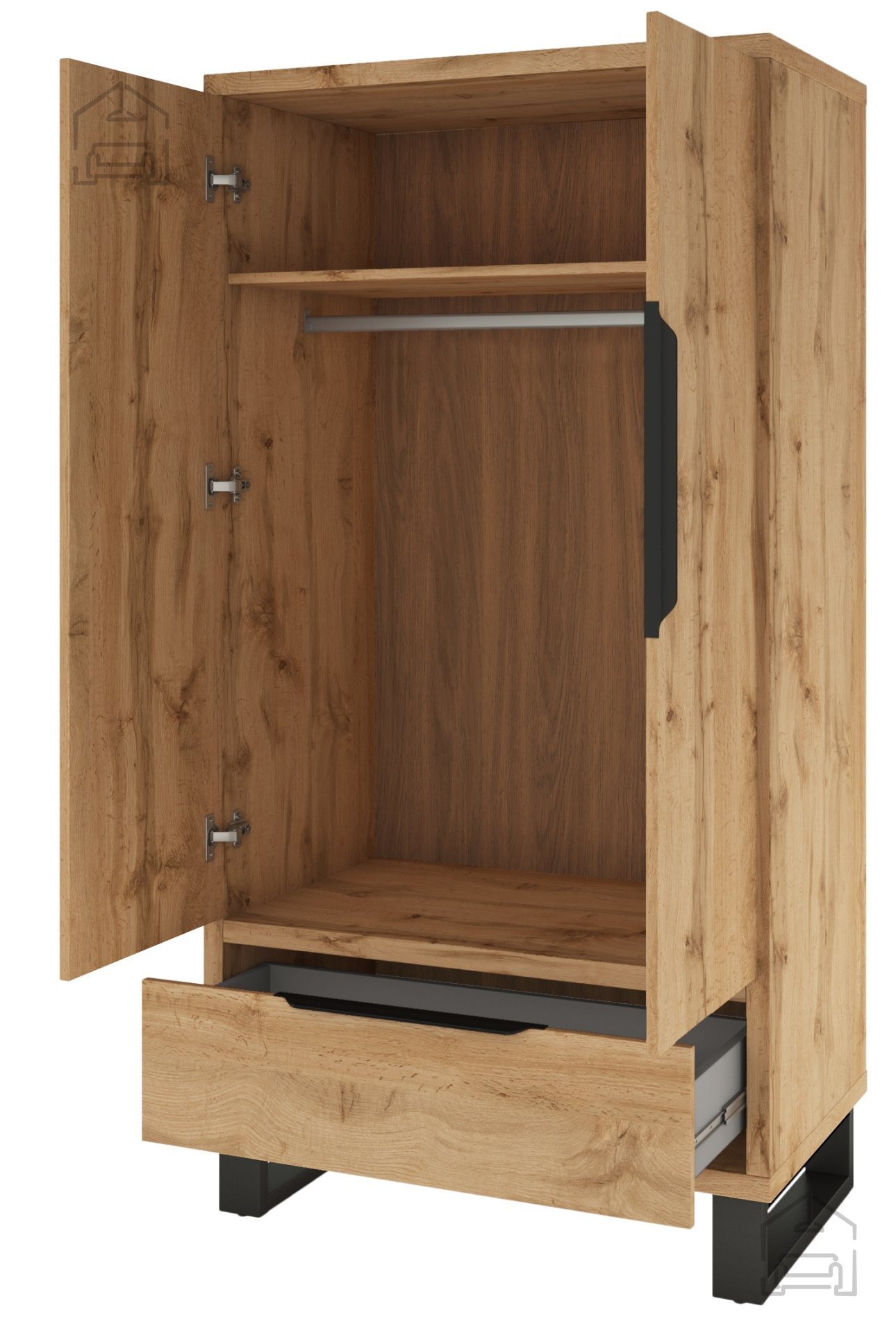 Garderobna omara Halle - 24N0HK18 je opremljena z dvema vrati in enim predalom, kar omogoča optimalno organizacijo vaših oblačil in dodatkov. Notranjost omare je prostorna in prilagodljiva, kar vam omogoča enostavno shranjevanje oblačil, obutve in drugih osebnih predmetov. Predal je idealen za shranjevanje manjših predmetov, ki jih želite imeti na dosegu roke.