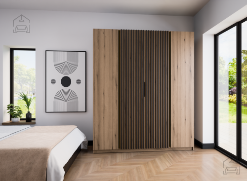 LED osvetlitev: za doplačiloDimenzije: 2000x2390x619 mm Garderobna omara Kaja je več kot le pohištvo za shranjevanje - je rezultat skrbnega oblikovanja s praktičnim pristopom k organizaciji prostora. Omogoča organiziranje tudi najobsežnejše garderobe ali kolekcije artiklov, pri tem pa ohraniti estetiko in visoko kakovost izdelave. Garderobna omara Kaja se odlično poda k vsakemu notranjemu oblikovanju in doda impresiven stilski pridih. | Material: Iveral in MDF
