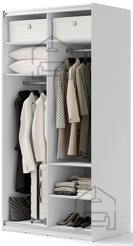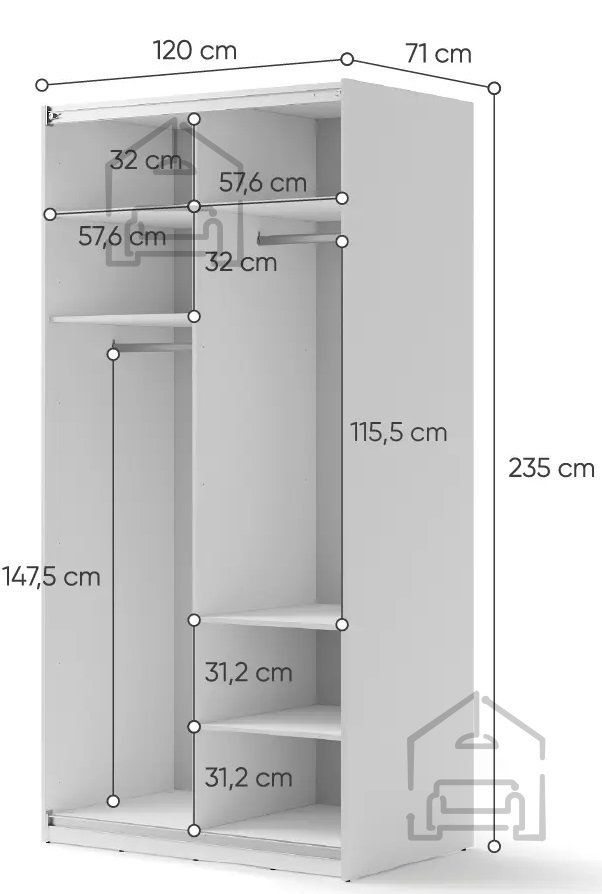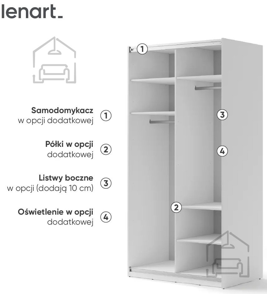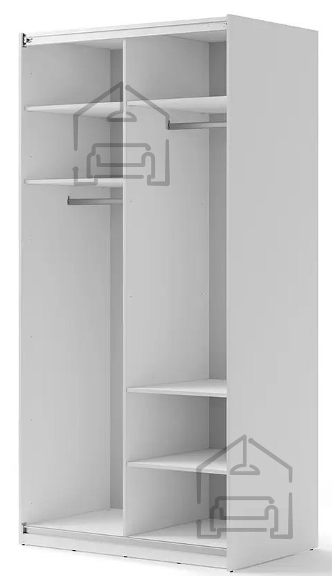 Investirajte v udobje in funkcionalnost z našo belo omaro z ogledalom širine 120 cm. Dodatno lahko omaro opremite z zapiralom za drsna vrata, posodami, policami, s pomočjo katerih lahko notranjost omare enostavno prilagodite svojim potrebam, ter trakom z osvetlitvijo, ki glede na razpoložljivo prostora, vam bo omogočil prilagajanje širine garderobne omare. | Material: Iveral in MDF
