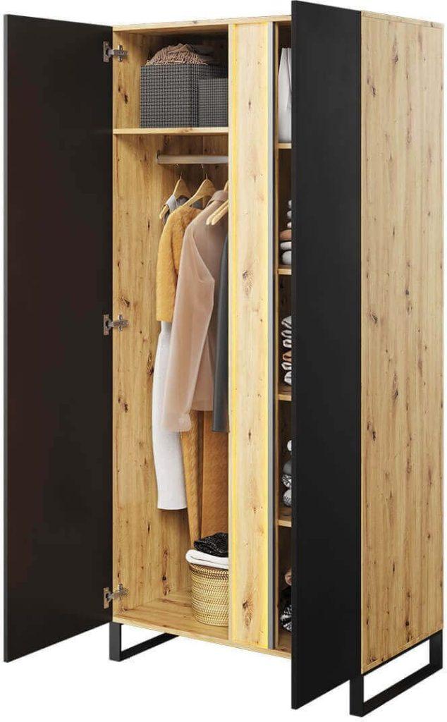 Kot del kolekcije Torin, omara izstopa zaradi odebeljenih stranic, kovinskih ročajev in žlebičaste letve v barvi hrasta venge magic. Ti detajli dodajajo trdnost in eleganco celotni zasnovi.