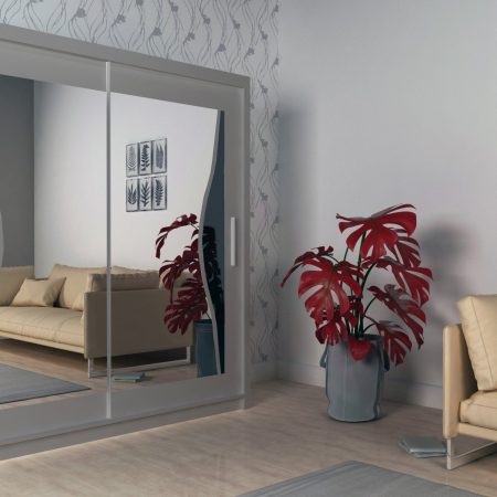 Drsna vrata z ogledalom: omara je opremljena z drsnimi vrati, kar omogoča enostaven dostop do notranjosti omare, obenem pa prihrani prostor v prostoru. Na srednjih vratih so nameščena ogledala, kar omogoča preverjanje videza in ustvarja občutek večje prostornosti.