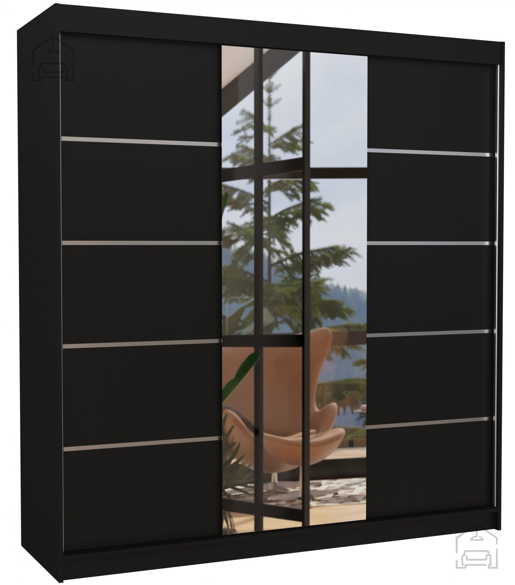 Barva: črnaDimenzije: 2000x2150x580 mm Drsna omara BERGEN je popoln način za organizacijo vašega prostora. Pohištvo je opremljeno s prostornimi policami in tirnico, na katero lahko obesite obleke, obleke, vrhnja oblačila ali srajce. Na sprednji strani je ogledalo in okrasne vodoravne srebrne črte, ki dajejo pohištvu edinstven stil. Ker je omara drsna, vam ni treba nameniti dodatnega prostora za odpiranje vrat, zaradi česar je odlična rešitev za majhno sobo ali ozko predsobo. | Material: Iveral in MDF