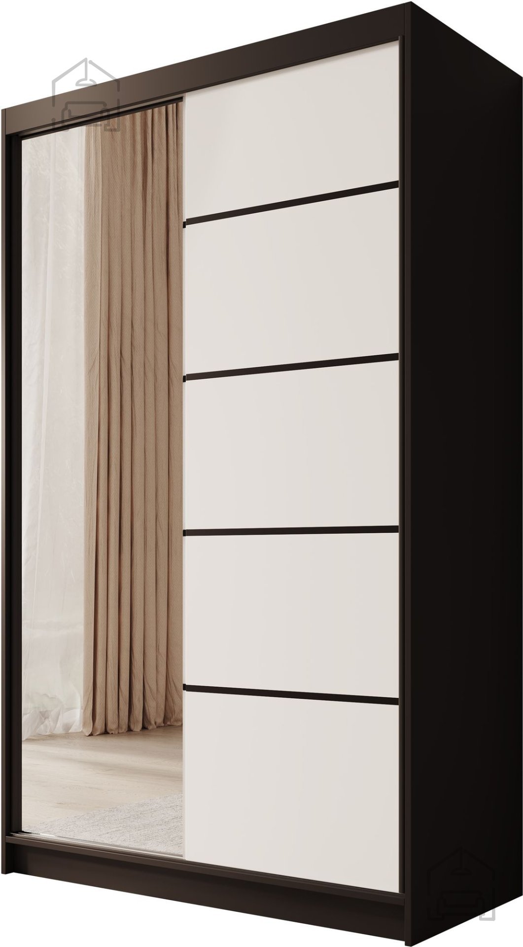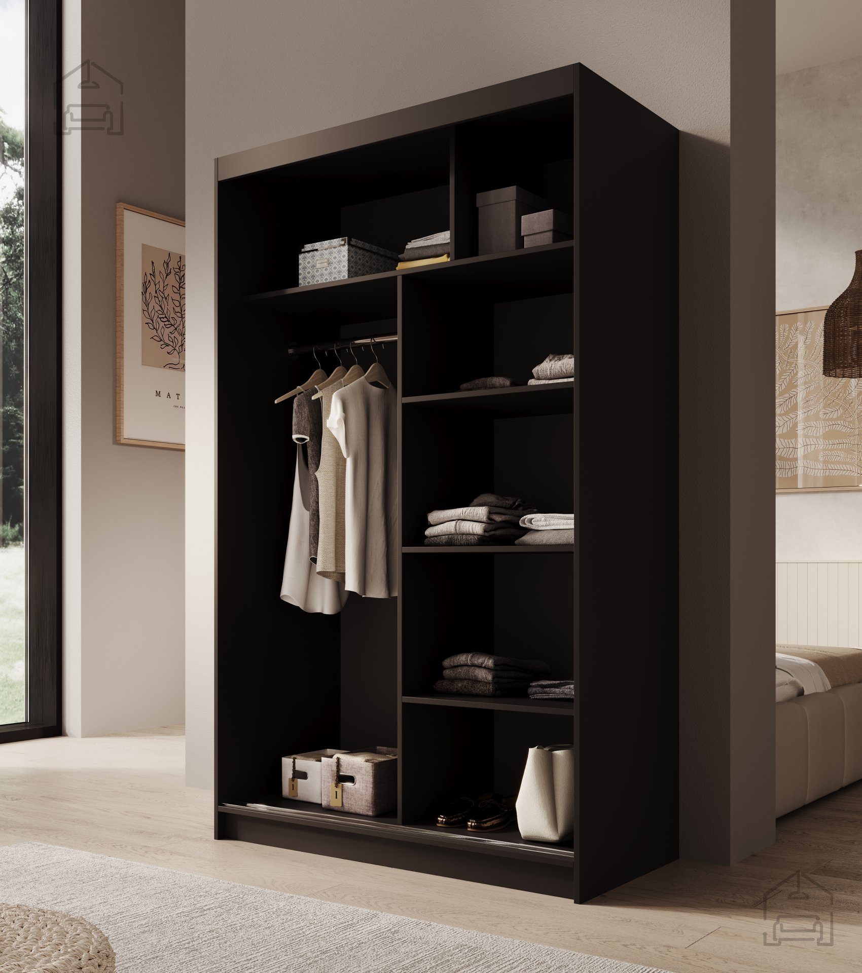 - Funkcionalnost: z drsnimi vrati prihranite na prostoru, medtem ko notranjost omare ponuja dovolj polic in obešalnikov za organizacijo vaše garderobe.