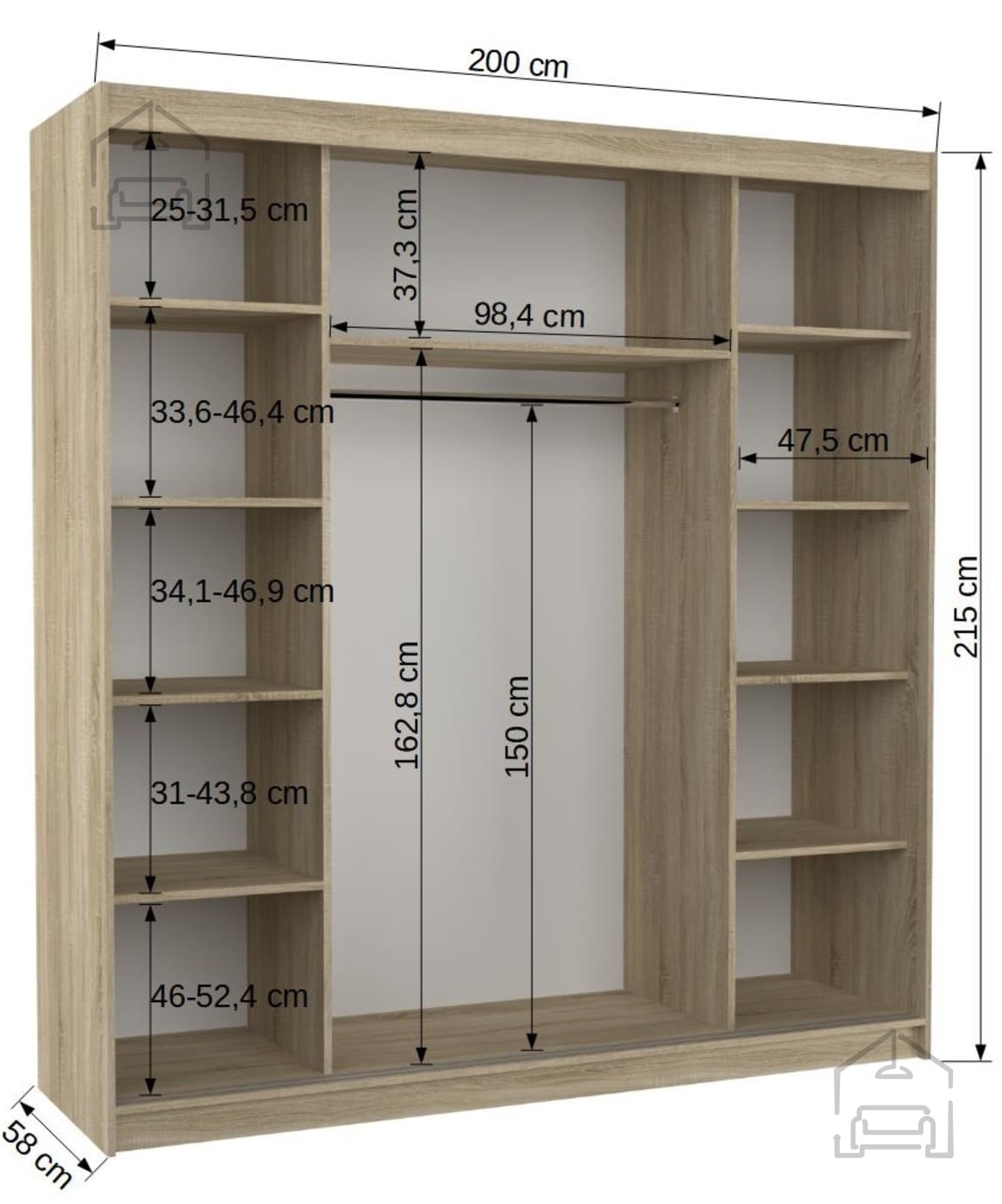 Barva korpusa: sonoma hrast/belaDimenzije: 2000x2150x580 mm Drsna omara DALMACIJA je popoln način za organizacijo vašega prostora. Pohištvo je opremljeno s prostornimi policami in tirnico, na katero lahko obesite obleke, obleke, vrhnja oblačila ali srajce. Na sprednji strani je ogledalo in okrasne vodoravne srebrne črte, ki dajejo pohištvu edinstven stil. Ker je omara drsna, vam ni treba nameniti dodatnega prostora za odpiranje vrat, zaradi česar je odlična rešitev za majhno sobo ali ozko predsobo. | Material: Iveral in MDF