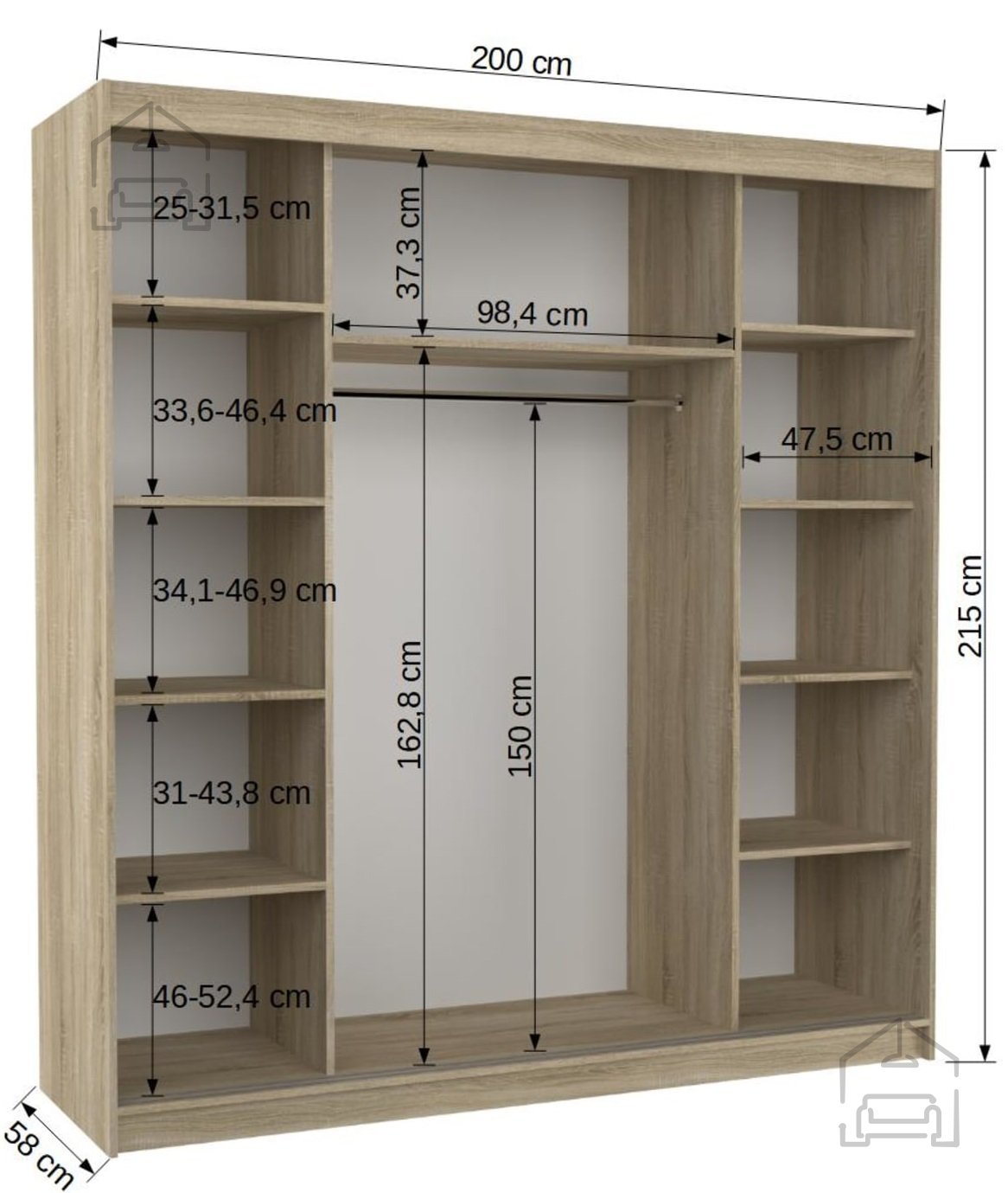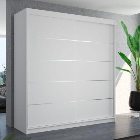 Barva fronta: belaDimenzije: 2000x2150x580 mm Drsna omara ESTEVA je popoln način za organizacijo vašega prostora. Pohištvo je opremljeno s prostornimi policami in tirnico, na katero lahko obesite obleke, obleke, vrhnja oblačila ali srajce. Na sprednji strani so okrasne vodoravne srebrne črte, ki dajejo pohištvu edinstven stil. Ker je omara drsna, vam ni treba nameniti dodatnega prostora za odpiranje vrat, zaradi česar je odlična rešitev za majhno sobo ali ozko predsobo. | Material: Iveral in MDF