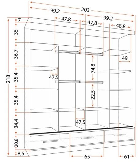 - Notranjost garderobne omare je razdeljena na dve coni, kar omogoča optimalno organizacijo. Ponuja 12 polic, 4 obešala za oblačila ter 3 predale, kar je idealno za shranjevanje oblačil, čevljev, posteljnine in brisač.