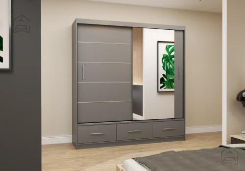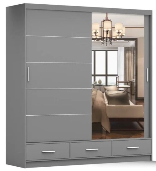 Ta omara s predali je na voljo v univerzalnih barvah, kot so bela, črna in siva, kar pomeni, da se bo brez težav vključila v vašo spalnico, garderobo, dnevno sobo ali otroško sobo. Sistem drsnih vrat omogoča enostavno uporabo in prihrani dragocen prostor, kar je še posebej pomembno v manjših stanovanjih.