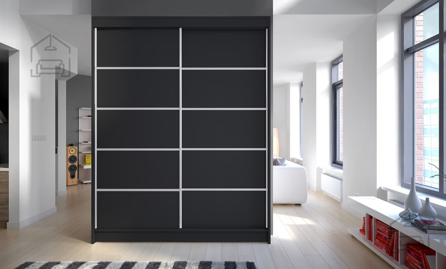 LED luči: za doplačiloDimenzije: 1500x2000x580 mm V svetu pohištva, kjer sta funkcionalnost in stil ključnega pomena, se garderobna omara z drsnimi vrati Luft - 150 cm - črna izkaže kot odlična izbira za vsak dom. Ta elegantna omara, izdelana iz visokokakovostnega iverala in MDF materiala, ponuja ne le praktičnost, temveč tudi estetsko dovršenost. Z dimenzijami 150x58x200 cm se popolnoma prilagodi različnim prostorom, ne glede na to, ali gre za spalnico, predsobo ali garderobno sobo.