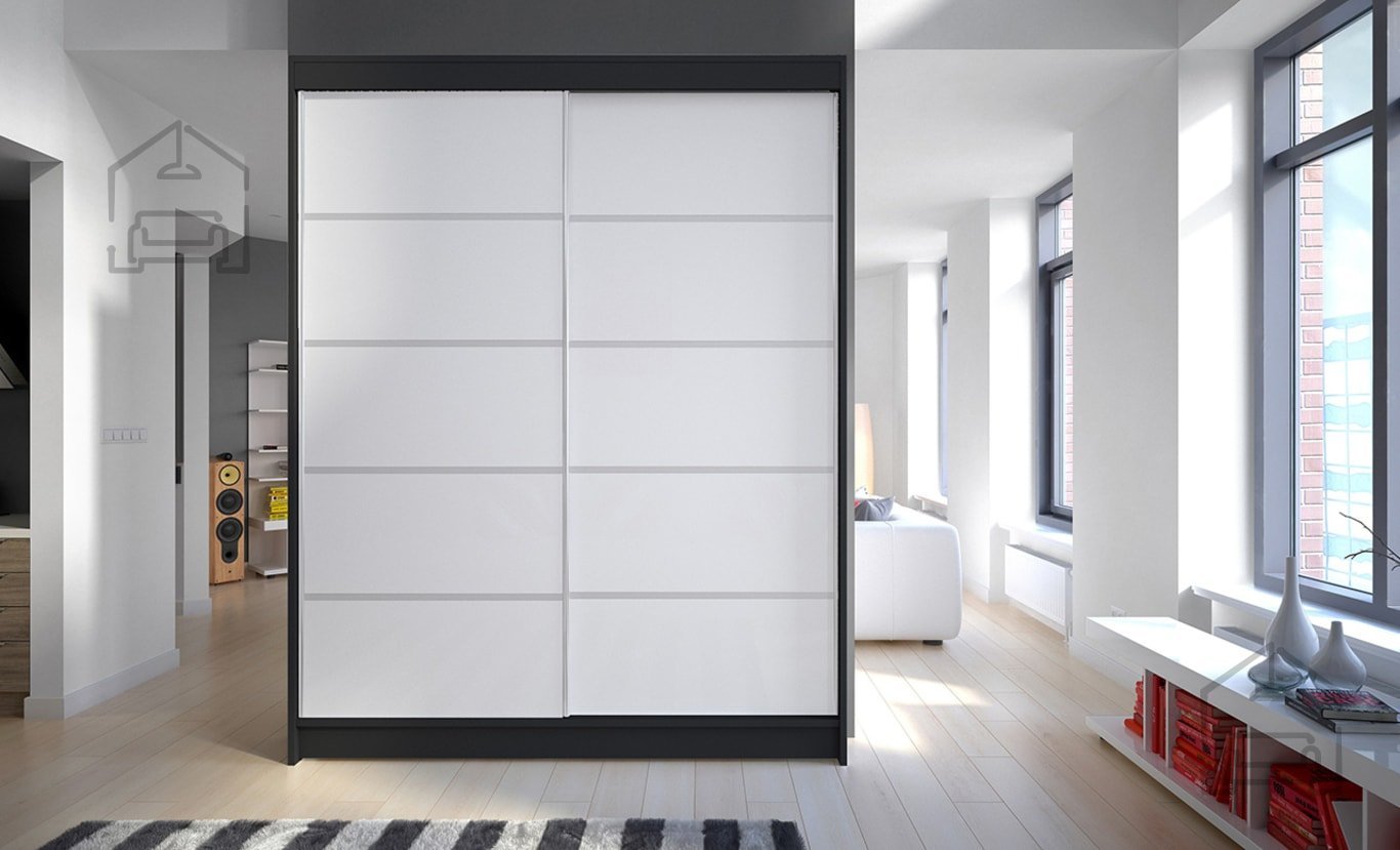 LED luči: za doplačiloDimenzije: 1500x2000x580 mm Drsna omara LUFT je popoln način za organizacijo vašega prostora. Pohištvo je opremljeno s prostornimi policami in tirnico, na katero lahko obesite obleke, obleke, vrhnja oblačila ali srajce. Na sprednji strani so značilne vodoravne srebrne črte, ki dajejo pohištvu edinstven stil. Ker je omara drsna, vam ni treba nameniti dodatnega prostora za odpiranje vrat, zaradi česar je odlična rešitev za majhno sobo ali ozko predsobo. Dodatna prednost je možnost nakupa spektakularne LED osvetlitve, ki bo garderobi in prostoru dodala čudovit čar. | Material: Iveral in MDF
