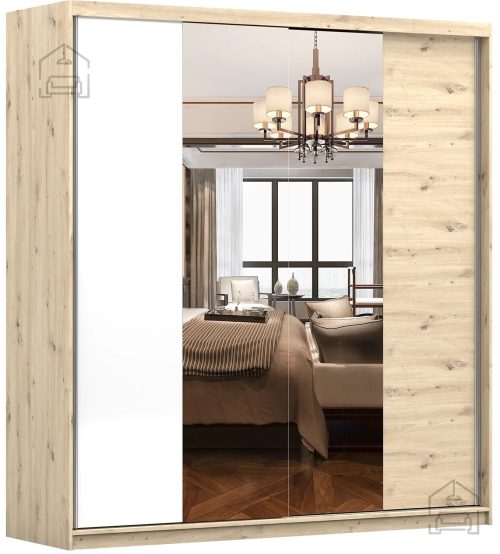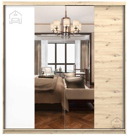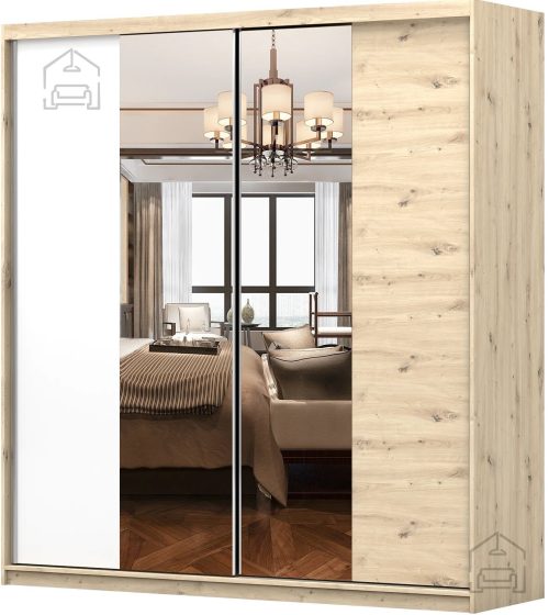- Velika ogledala na sredini obeh kril in črni ročaji dajejo omari moderen videz.