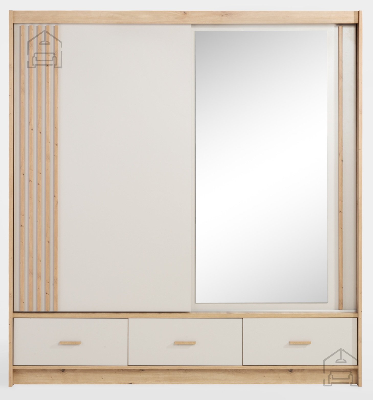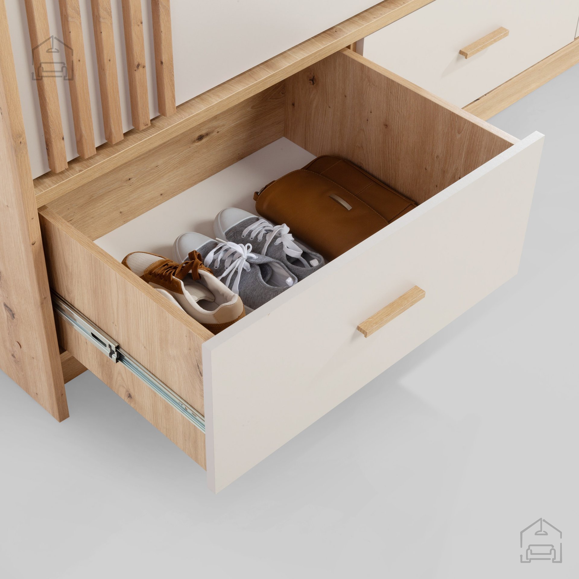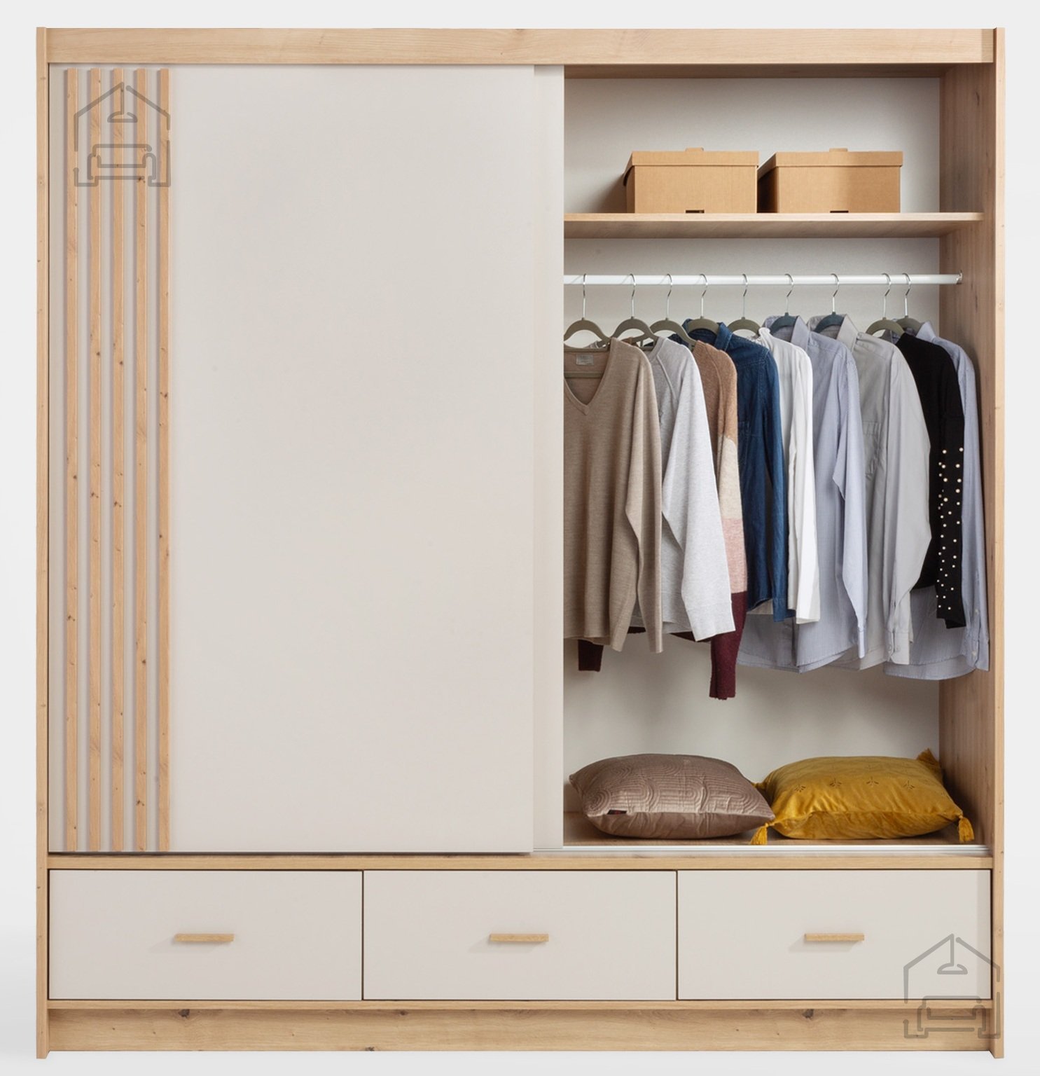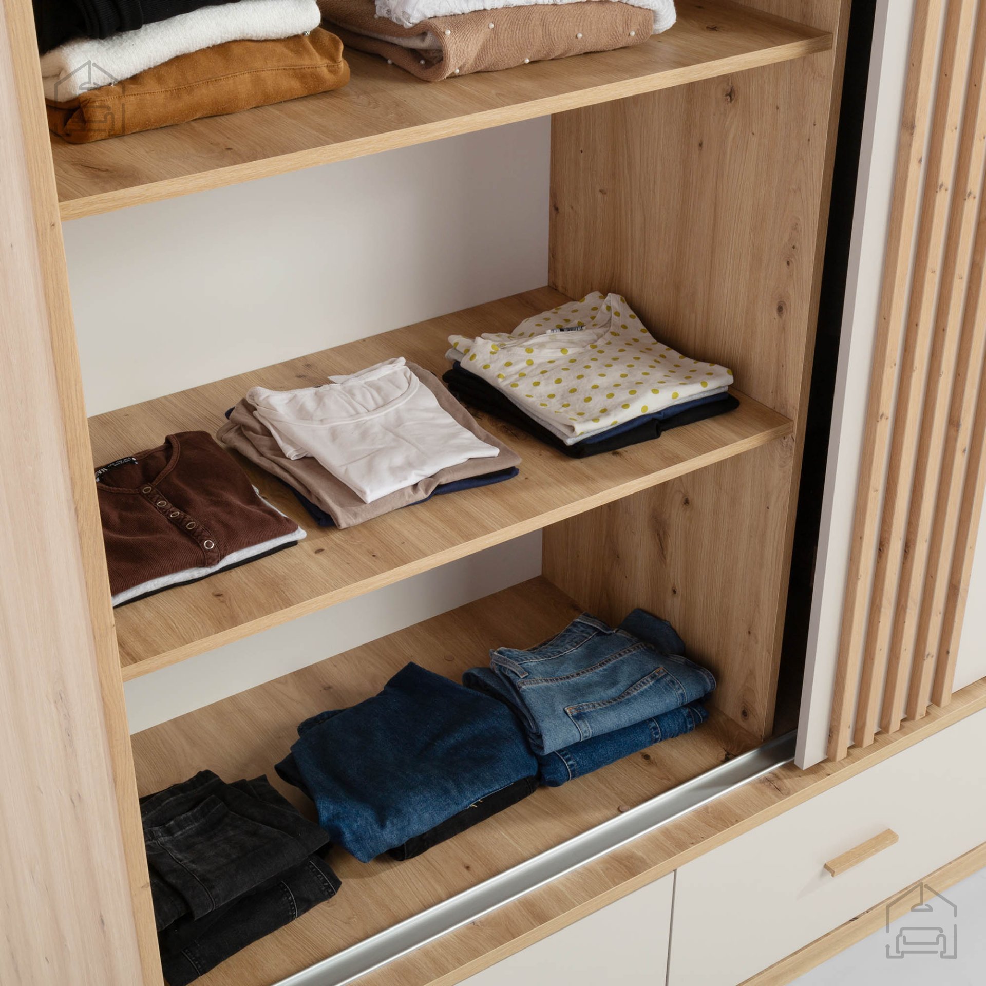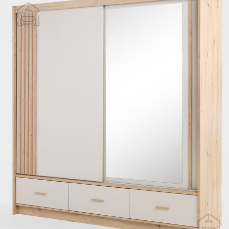- Estetika in eleganca: Nevtralna barvna paleta bež in hrasta artisan omogoča, da omara postane osrednji kos v vsaki sobi, hkrati pa se zlahka ujema z obstoječim pohištvom.