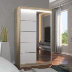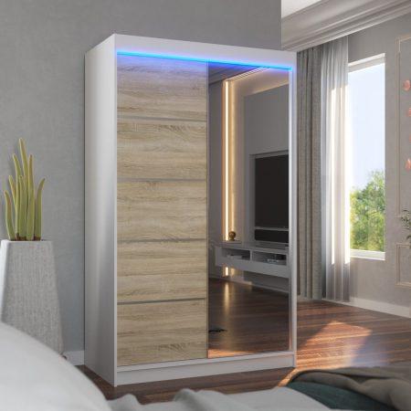 LED luči: za doplačiloDimenzije: 1200x2000x580 mm Garderobne omare so zelo pomemben del vašega doma, ker prevladujejo ne le na videz, temveč nudijo tudi prostornost. Garderobna omara z drsnimi vrati Nicea je popolna za vsako sobo, saj ponujaveliko prostora za shranjevanje z visečimi stojali in policami.
