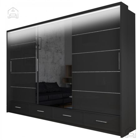 Barva: ČrnaDimenzije: 2530x2200x660 mm Garderobna omara z drsnimi vrati Sycylia LED 250 je privlačen in funkcionalen kos pohištva, ki lahko odlično dopolni vašo spalnico ali drug prostor.