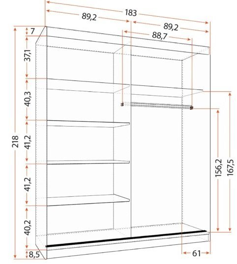Omara je zasnovana s sistemom drsnih vrat, kar pomeni, da ne zavzema dodatnega prostora, kar je še posebej pomembno v manjših prostorih. Zasnova je razdeljena na dva dela, ki sta opremljena z več prostornimi policami in palico za oblačila, kar omogoča učinkovito organizacijo vaših oblačil in dodatkov.