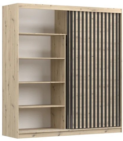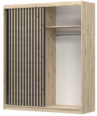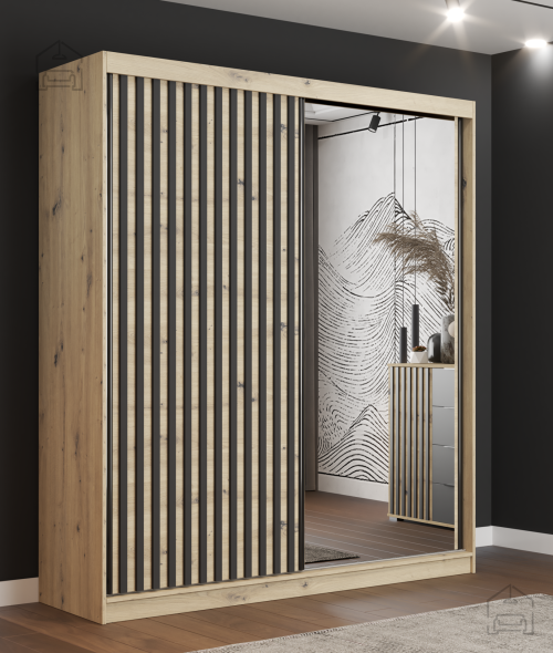Na enem izmed drsnih vrat se nahaja veliko ogledalo, kar vam omogoča hitro preverjanje vašega videza pred odhodom. Dekorativne črne lamele dodajajo sodoben videz in se odlično ujemajo z barvo artisan hrasta. Aluminijasti ročaji, ki se elegantno razprostirajo vzdolž drsnih vrat, zagotavljajo enostavno in udobno uporabo.