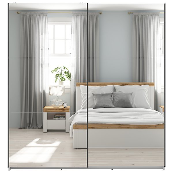 Dve drsni, zrcalni sprednji dela omare, ki poleg tega, da omogočata enostaven dostop do vaše garderobe, tudi vizualno povečata prostor in dodata eleganco.