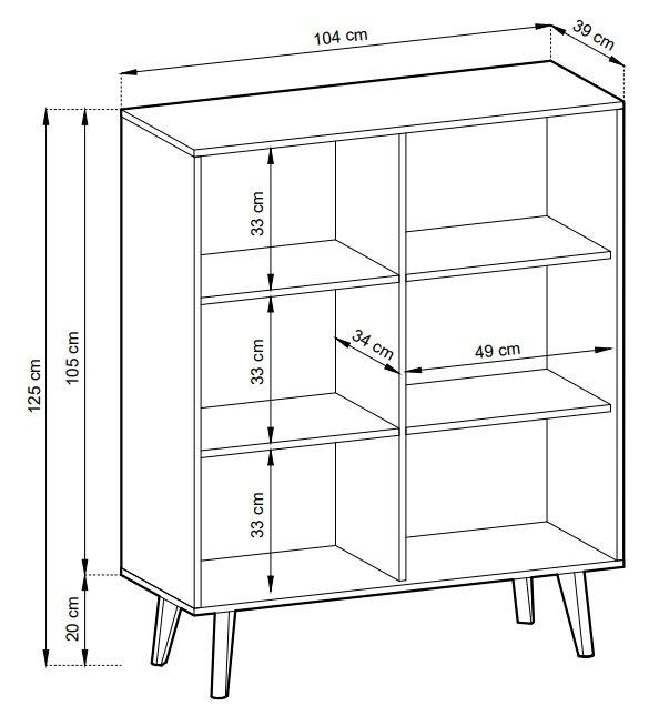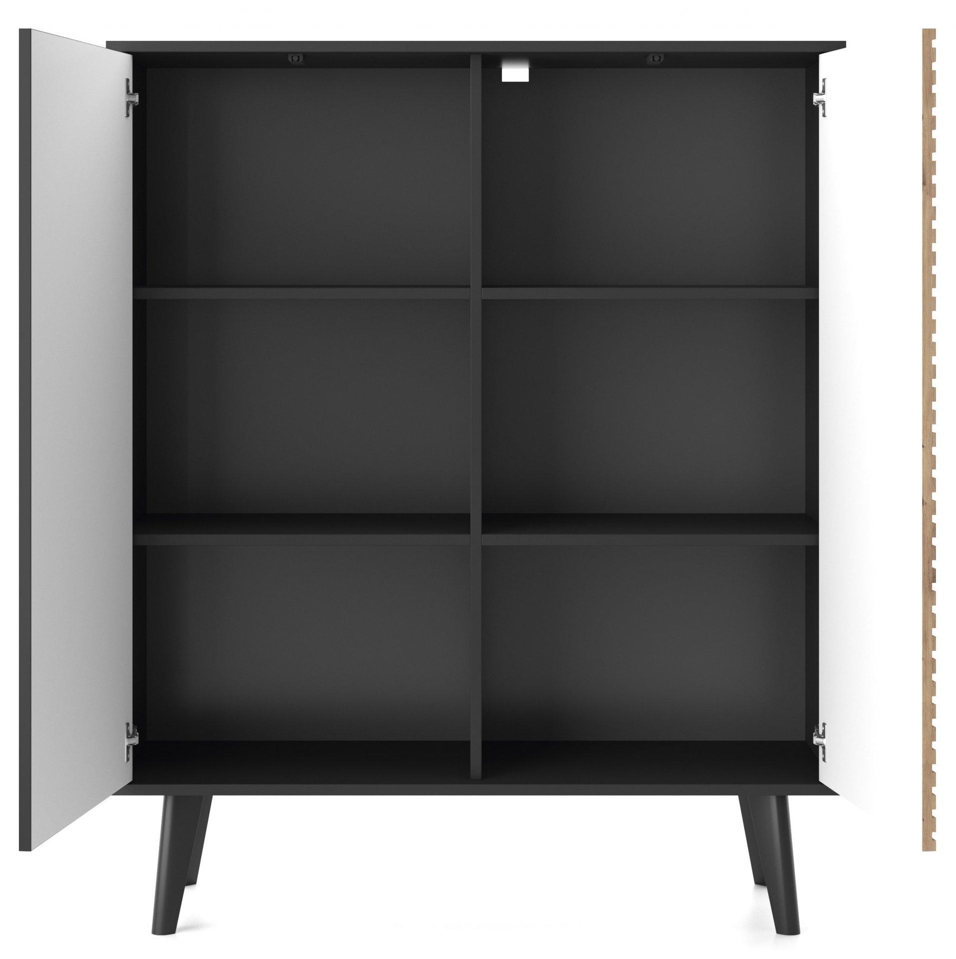 Dimenzije: 1040x1250x390 mm Wilow je izvirna kolekcija pohištva za dnevno sobo v industrijskem stilu. Barve pohištva so unikatna kombinacija artisan hrasta in črne, ki bo v notranjost vnesla toplo vzdušje. Sistem je izdelan iz kvalitetne laminirane plošče in MDF, ABS robovi, ki povečujejo odpornost pohištva na poškodbe. Horizontalne linije valovitih front (obrtniški hrast) so v kontrastu s temnim glavnim delom, postavljenega visoko na diagonalne lesene nogice, ki se širijo navzgor. Sistem za odpiranje spredaj brez ročaja.