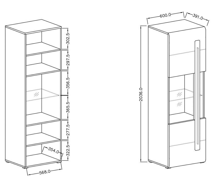 Dimenzije izdelka so 60x39.1x203.6 cm, kar pomeni, da vitrina ponuja dovolj prostora za shranjevanje vaših najljubših predmetov. Njena višina omogoča optimalno izkoriščenost prostora, ne da bi pri tem ogrožala vizualno privlačnost prostora.