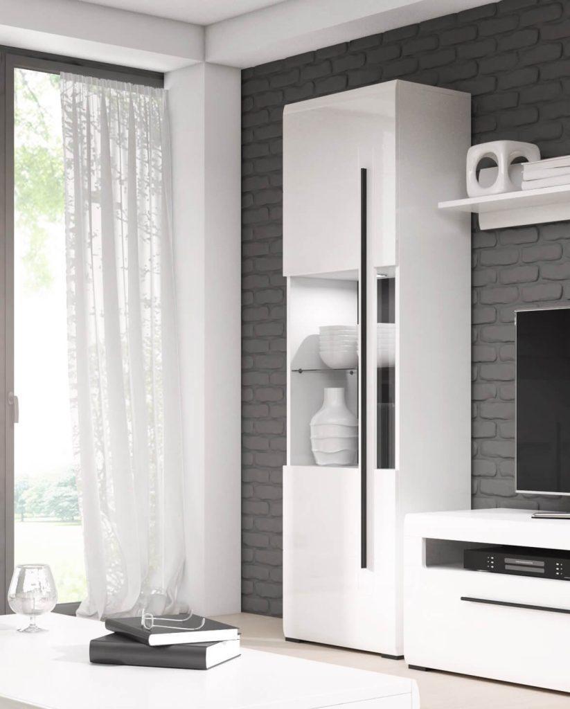 Vitrina Tulsa je izdelana iz MDF materiala, kar ji zagotavlja izjemno trpežnost in dolgo življenjsko dobo. Njen bela sijaj zaključek v korpusu in frontah prispeva k sodobnemu in prestižnemu videzu, ki se zlahka prilagodi vsakemu notranjemu oblikovanju.