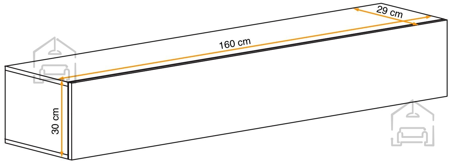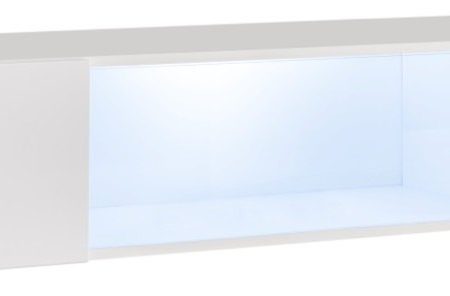 Barva fronta: bela visok sijajDimenzije: 1500x300x290 mm Stenska polica s 3 delno zastekljenimi predali in modro LED lučko.