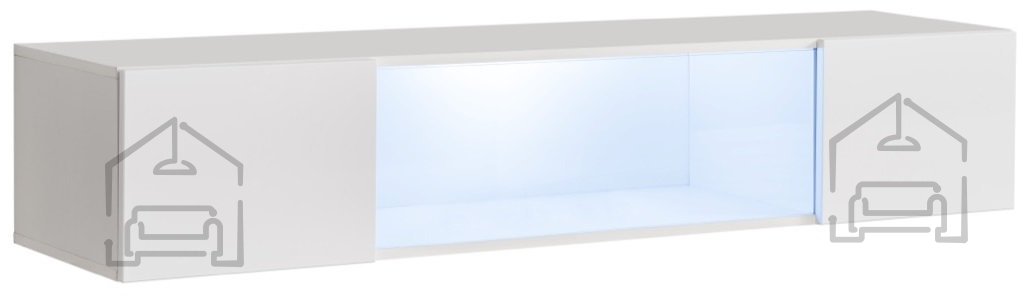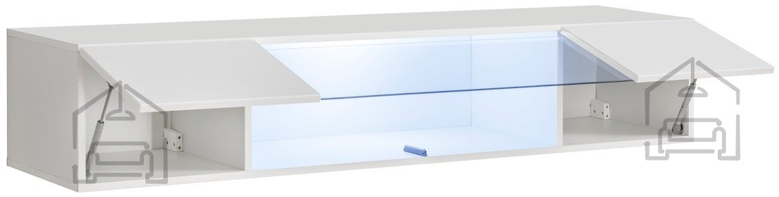 Barva fronta: bela visok sijajDimenzije: 1500x300x290 mm Stenska polica s 3 delno zastekljenimi predali in modro LED lučko.
