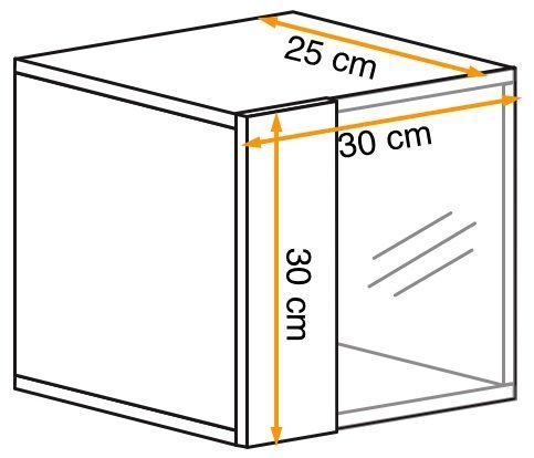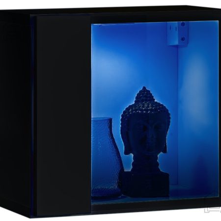 Barva korpusa: črna mat Barva fronta: črna sijaj Dimenzije: 300x300x300 mm Viseča omarica z delno zastekljenimi vrati ter 1 polico z modro LED lučko. Omara se odpira s pritiskom. | Material: Bor