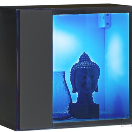 Barva korpusa: grafit Barva fronta: grafit visok sijaj Dimenzije: 300x300x300 mm Viseča omarica z delno zastekljenimi vrati ter 1 polico z modro LED lučko. Omara se odpira s pritiskom. | Material:Barva materiala: Črna mat/Črna mat, Črna mat/Hrast Artisan