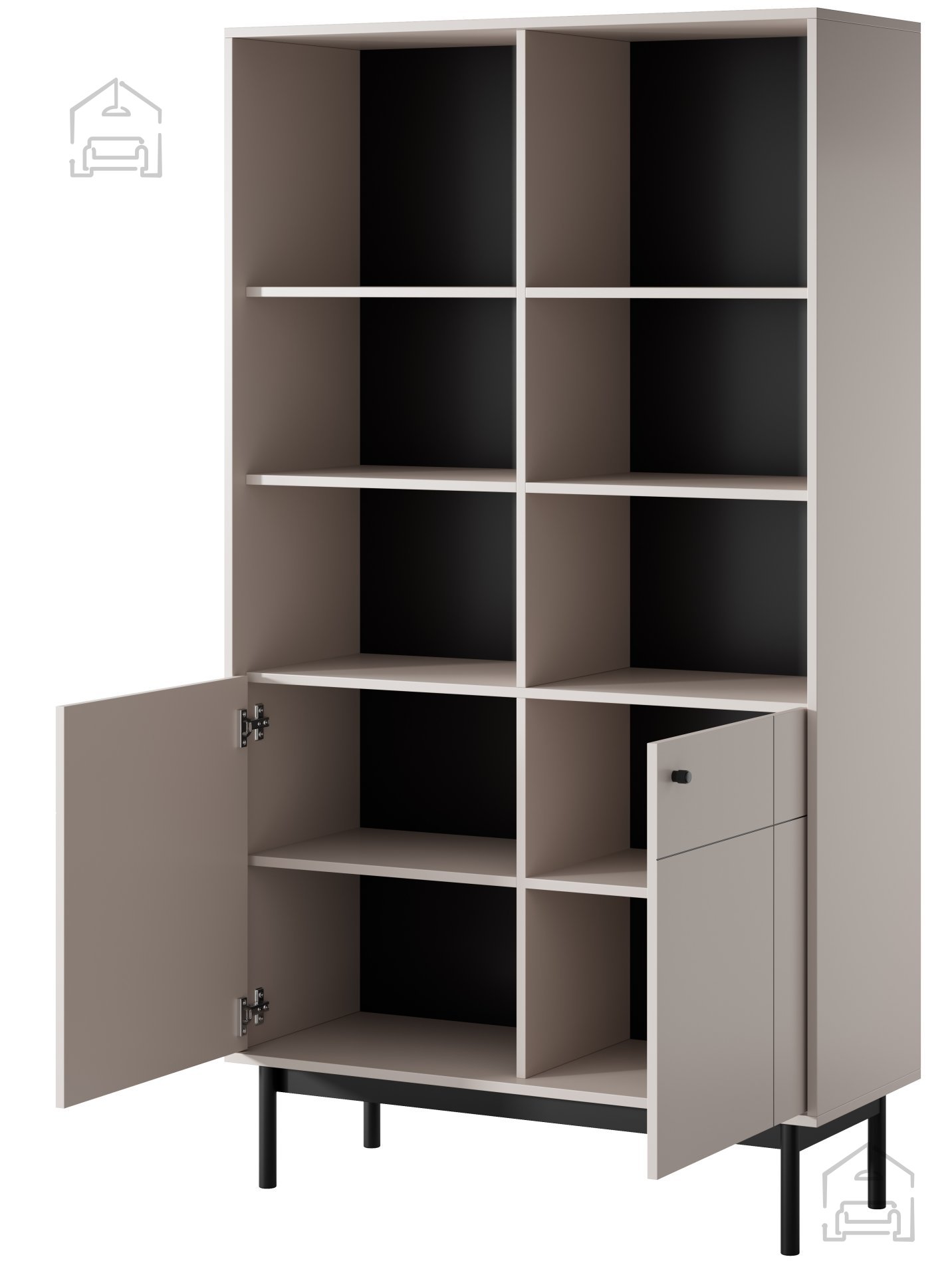 Regal je opremljen s kovinskimi gumbi, pobarvanimi v črno barvo, ki dodajajo pridih elegance. Panti Haefele z mehkim zapiranjem omogočajo gladko in tiho delovanje vrat.