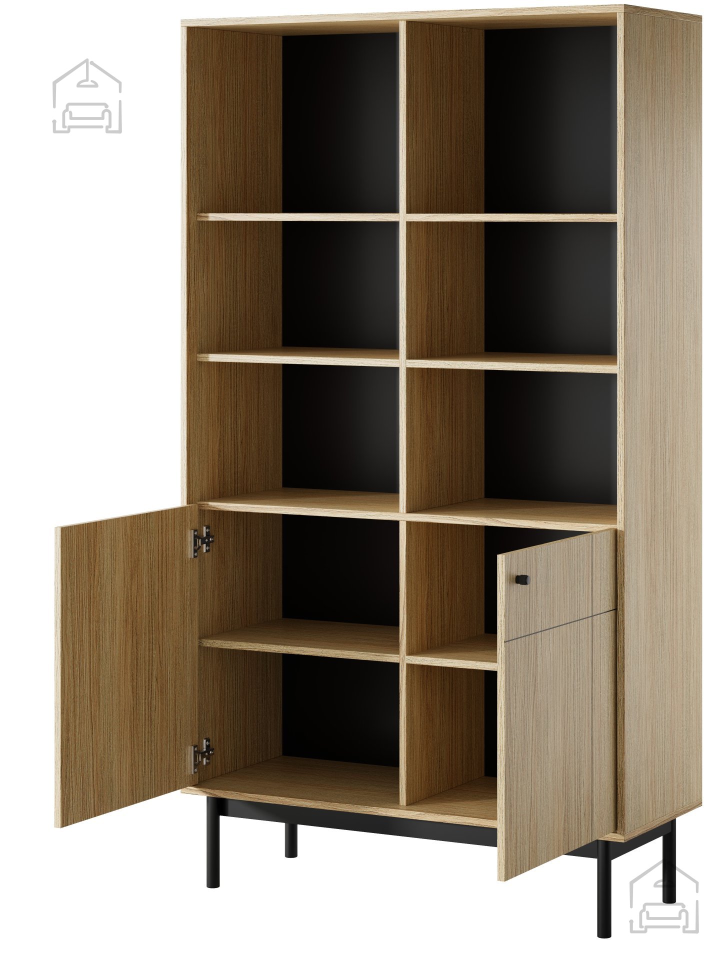 Regal je opremljen s kovinskimi gumbi, pobarvanimi v črno barvo, ki dodajajo pridih elegance. Panti Haefele z mehkim zapiranjem omogočajo gladko in tiho delovanje vrat.