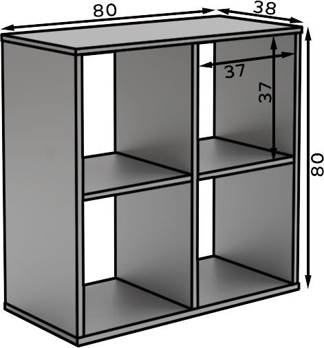 Regal Lenti 2x2 meri kompaktnih 80x38x80 cm, kar omogoča enostavno umestitev v vsak kotiček vašega doma. Izdelan je iz kakovostne laminirane plošče debeline 18 mm, ki zagotavlja trpežnost in stabilnost, obenem pa prinaša sodoben videz.