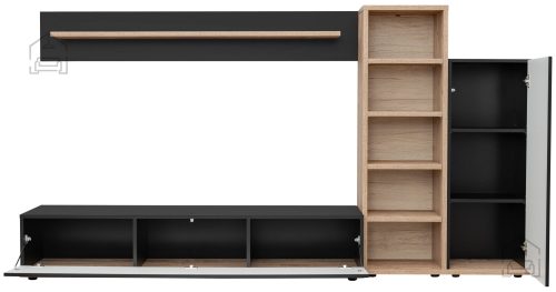 • Optimalna organizacija: RTV enota z eno loputo in tremi predelki za njo omogoča priročno organizacijo vaše multimedijske opreme, kar zagotavlja, da bo vaša dnevna soba vedno urejena in brez nepotrebnega nereda.