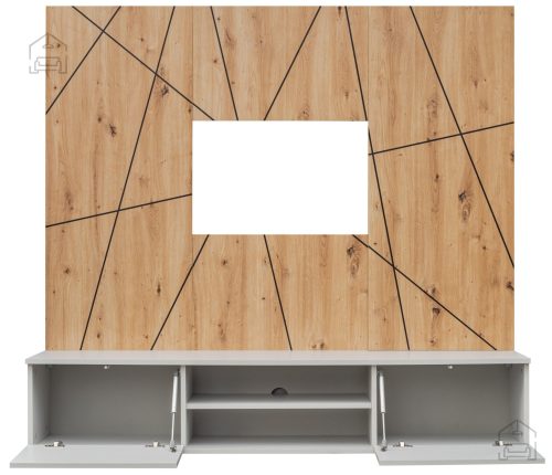 2. Vsestranska funkcionalnost: Regal ponuja dovolj prostora za shranjevanje in razporeditev vaše RTV opreme. Bočne omarice z vrati skrivajo dodatne komore za shranjevanje, medtem ko osrednji odprt prostor, razdeljen s polico, omogoča enostavno postavitev vaših naprav.