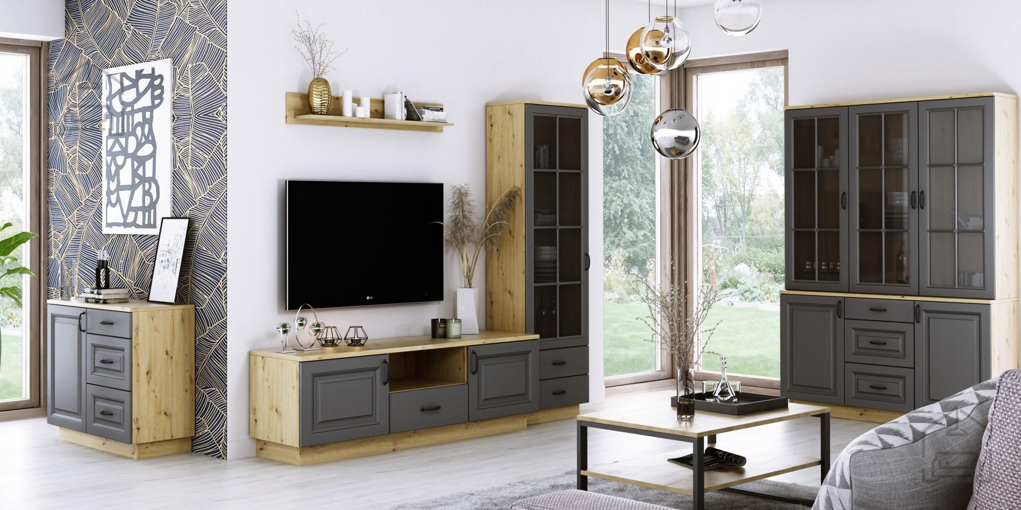 RTV komoda Flawia RTV 2D1S je v barvi hrast artisan/bela, hrast artisan/grafit