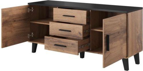 Barva: Lefkas oak in črna Dimenzije: 1650x940x430 mm Pohištveni elementi dnevnih sob so si bolj ali manj podobni, ločijo pa se v različnih stilih, barvah in predvsem detajlih. Prav detajli so tisti, ki določeno linijo oz. kolekcijo naredijo unikatno, posebno in toliko bolj atraktivno. Če sodite med tiste, ki date na mogočen izgled, potem se vam splača ozreti po dnevni sobi Baltica – lefkas. Vintage izgledIzjemen vintage izgled, ki ga ustvari barva lefkas hrasta z rahlimi detajlnimi poudarki črne, bo oplemenitil prav vsako dnevno sobo. Dnevna soba Baltica – lefkas, za katero je poskrbel poljski proizvajalec notranjega pohištva ML Meble, je tako zelo priljubljen izbor uporabnikov naše spletne strani zaradi svojega mogočnega, robustnega, a elegantnega izgleda v enem. Še posebej bo do izraza prišla v večjih (tudi zaradi precejšnjega števila različnih elementov) in bolj svetlih dnevnih prostorih. V kolikor ocenjujete, da je barva lefkas hrasta (lefkas oak) za vaš dnevni prostor pretemna, lahko posežete po svetlejšem odtenku, in sicer boste to dnevno sobo našli v iskalniku pod imenom Dnevna soba Baltica. Kolekcija Baltica – lefkas je sestavljena iz številnih elementov. Poglejmo, katerih:
