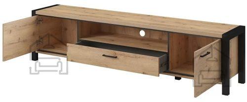 Kolekcija pohištva za dnevne sobe AKTIV je oblikovana v industrijskem slogu, ki ga odlikujejo preprostost oblik, brutalnost in praktičnost. Nenavadna obdelava pohištva bo vsaki notranjosti dala edinstven značaj. Na podlagi barve naravnega lesa z značilno teksturo in vzorcem uokvirja globoko črno barvo. Ta kombinacija izgleda zelo dinamično, kontrastno in hkrati popolno! Zbirka več elementov ponuja neomejene možnosti postavitve, medtem ko praktične oblikovalske rešitve omogočajo ustvarjanje lepe in funkcionalne notranjosti dnevne sobe.