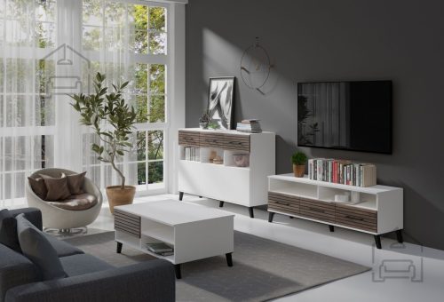 Izjemen vintage izgled, ki ga ustvari barva lefkas hrasta z rahlimi detajlnimi poudarki črne, bo oplemenitil prav vsako dnevno sobo. Dnevna soba Baltica – lefkas, za katero je poskrbel poljski proizvajalec notranjega pohištva ML Meble, je tako zelo priljubljen izbor uporabnikov naše spletne strani zaradi svojega mogočnega, robustnega, a elegantnega izgleda v enem. Še posebej bo do izraza prišla v večjih (tudi zaradi precejšnjega števila različnih elementov) in bolj svetlih dnevnih prostorih. V kolikor ocenjujete, da je barva lefkas hrasta (lefkas oak) za vaš dnevni prostor pretemna, lahko posežete po svetlejšem odtenku, in sicer boste to dnevno sobo našli v iskalniku pod imenom Dnevna soba Baltica.