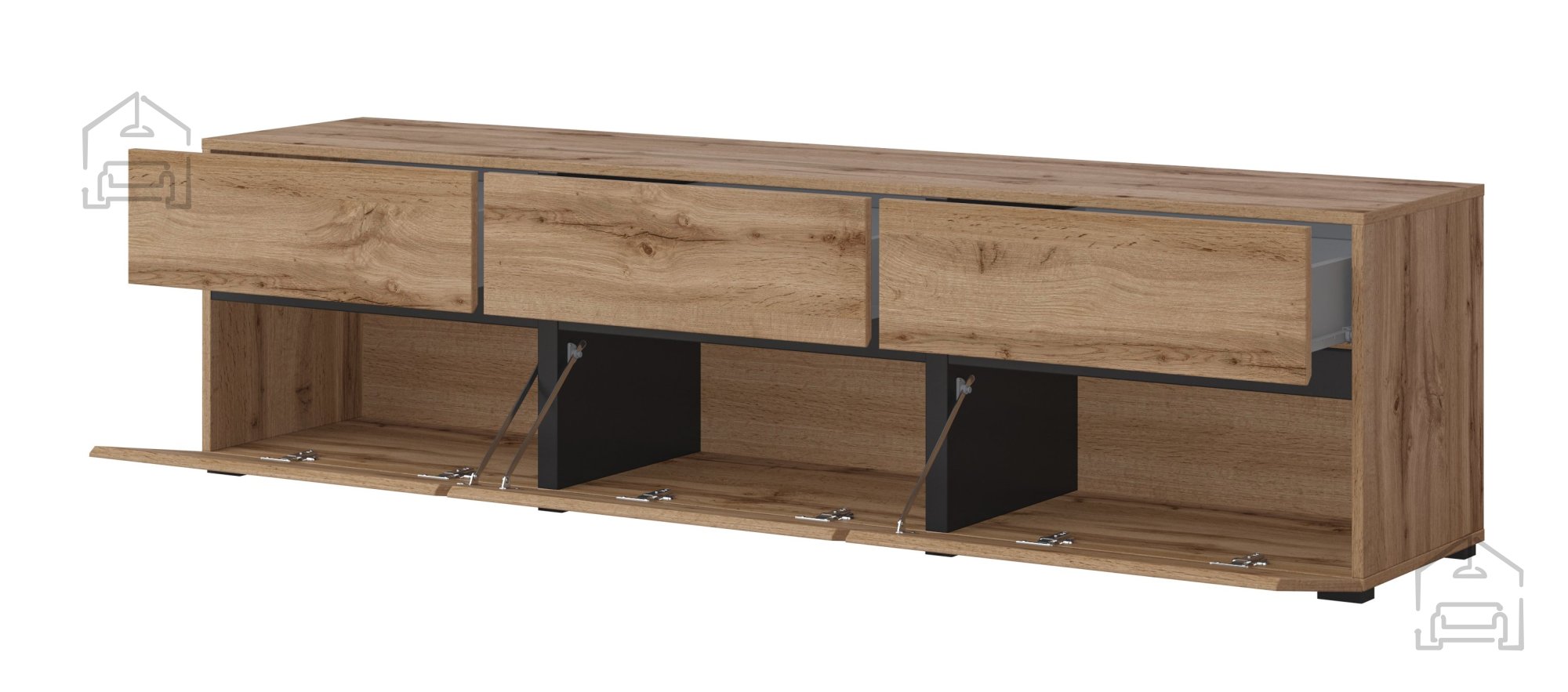 - Sodobna estetika: TV komoda Cross je zasnovana v privlačni barvi hrasta votan, ki se brezhibno ujema z različnimi notranjimi stili. Kombinacija votan-črne barve doda pridih prefinjenosti in sodobnosti, kar omogoča enostavno vključitev v vsak dom.