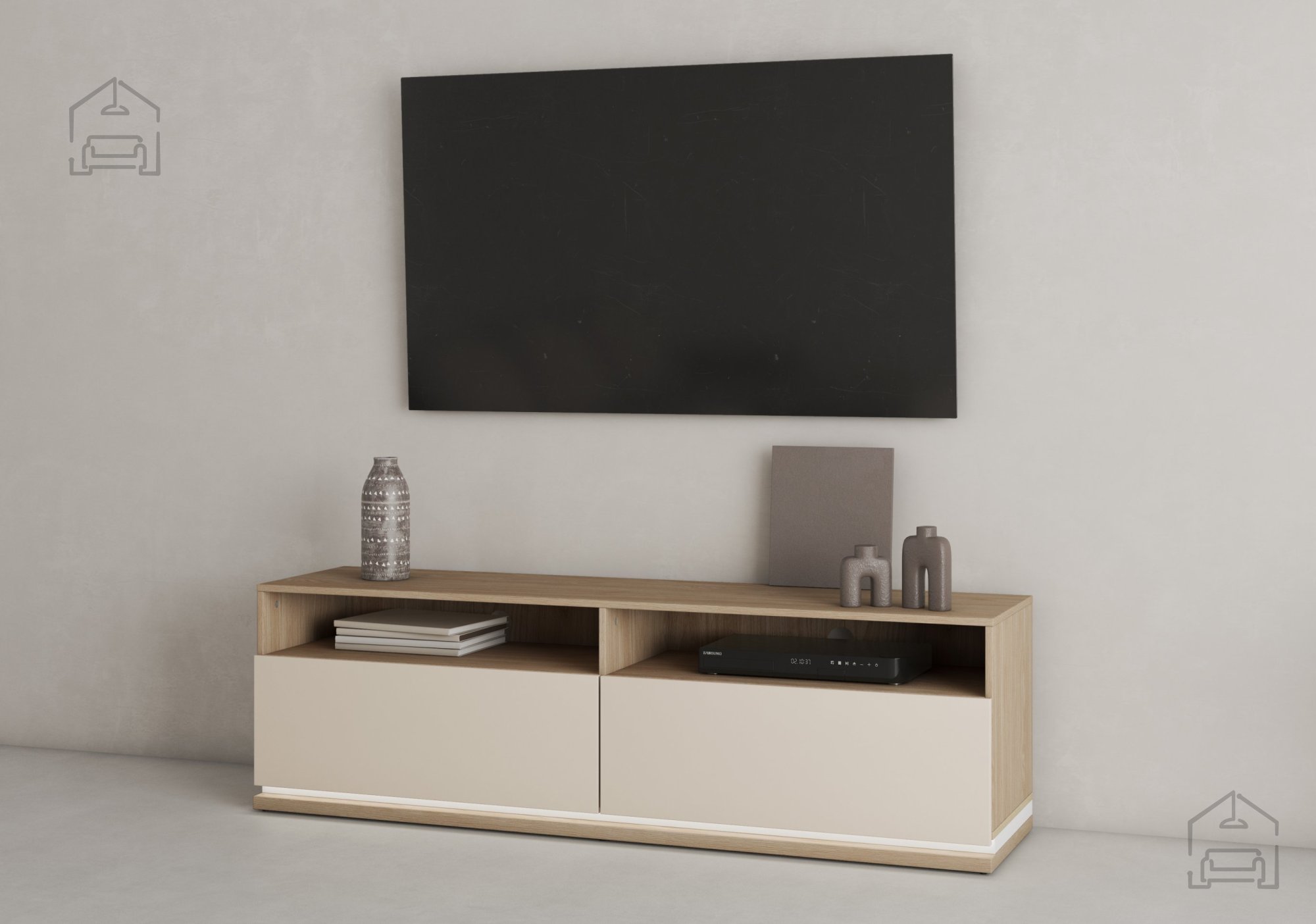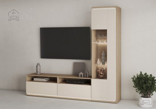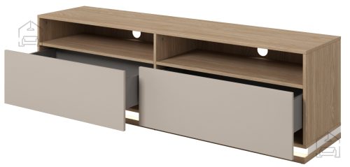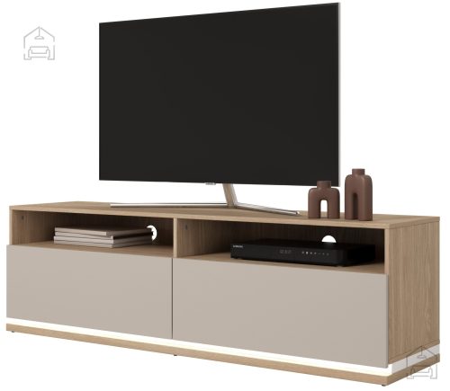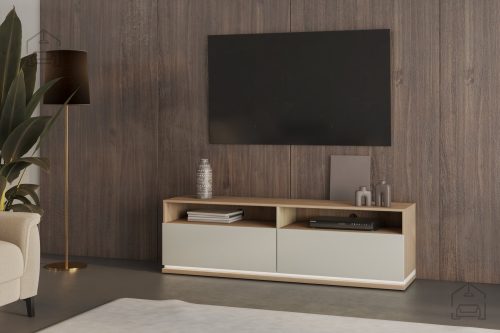 Eleganten dizajn: TV komoda Dore ni le funkcionalna, ampak tudi estetsko privlačna. Njena barva kašmir v kombinaciji z oljenim hrastom prinaša toplino in prefinjenost v vaš dom. Njene čiste linije in dovršen videz se brezhibno vključujejo v sodobne in klasične interierje.
