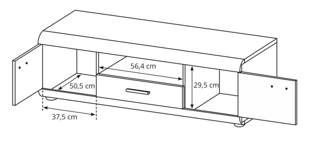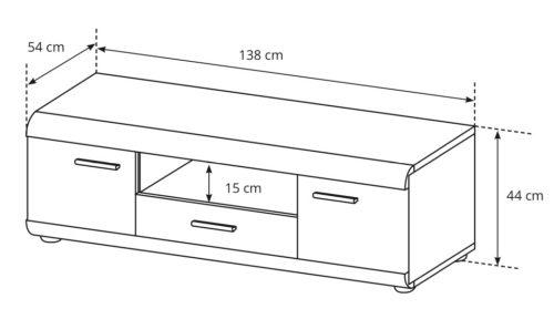 Dimenzije: 1380x440x540 mm TV komoda Elen z izvlečnim predalom in dvema omaricama.
