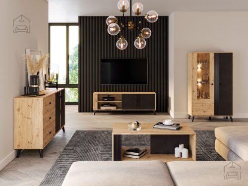 Moderno oblikovana dnevna soba Elizabeth je izdelana v kombinaciji dveh barv: Artisan hrast in črne