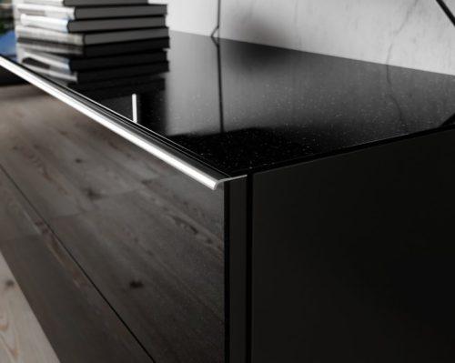 LED Opcija, za doplačiloDimenzije: 1796x495x478 mm Skrivnost elegance je v preprostosti - v skladu s to idejo kolekcija Helio pokaže, kako preprosta, minimalistična oblika pohištva ustreza sodobni notranjosti. Sijaj stekla in nežen krom, ki je zaključen z vodoravnimi linijami ročajev, dajejo notranjosti edinstven, eleganten značaj. Kolekcija je oblikovana v treh barvnih različicah: univerzalna in brezčasna bela - popolnoma predstavljena s kromiranimi zaključki, trenutno modna siva - v umirjenem srednjem odtenku ali originalna črna. | Material:Barva materiala: Črna mat/Črna mat, Črna mat/Hrast Artisan