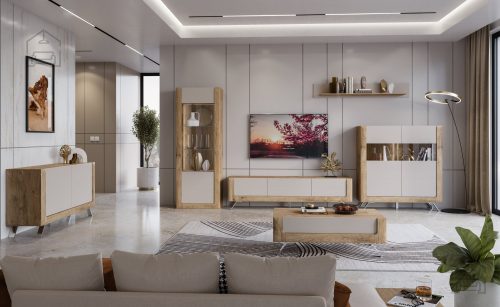Izjemen vintage izgled, ki ga ustvari barva lefkas hrasta z rahlimi detajlnimi poudarki črne, bo oplemenitil prav vsako dnevno sobo. Dnevna soba Baltica – lefkas, za katero je poskrbel poljski proizvajalec notranjega pohištva ML Meble, je tako zelo priljubljen izbor uporabnikov naše spletne strani zaradi svojega mogočnega, robustnega, a elegantnega izgleda v enem. Še posebej bo do izraza prišla v večjih (tudi zaradi precejšnjega števila različnih elementov) in bolj svetlih dnevnih prostorih. V kolikor ocenjujete, da je barva lefkas hrasta (lefkas oak) za vaš dnevni prostor pretemna, lahko posežete po svetlejšem odtenku, in sicer boste to dnevno sobo našli v iskalniku pod imenom Dnevna soba Baltica.