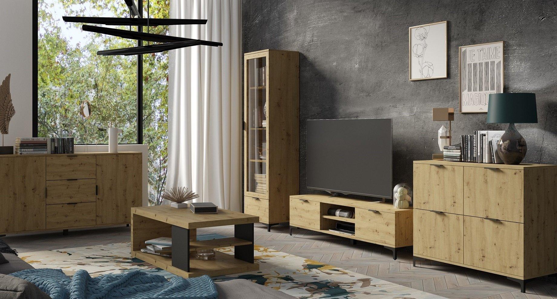 Izjemen vintage izgled, ki ga ustvari barva lefkas hrasta z rahlimi detajlnimi poudarki črne, bo oplemenitil prav vsako dnevno sobo. Dnevna soba Baltica – lefkas, za katero je poskrbel poljski proizvajalec notranjega pohištva ML Meble, je tako zelo priljubljen izbor uporabnikov naše spletne strani zaradi svojega mogočnega, robustnega, a elegantnega izgleda v enem. Še posebej bo do izraza prišla v večjih (tudi zaradi precejšnjega števila različnih elementov) in bolj svetlih dnevnih prostorih. V kolikor ocenjujete, da je barva lefkas hrasta (lefkas oak) za vaš dnevni prostor pretemna, lahko posežete po svetlejšem odtenku, in sicer boste to dnevno sobo našli v iskalniku pod imenom Dnevna soba Baltica.