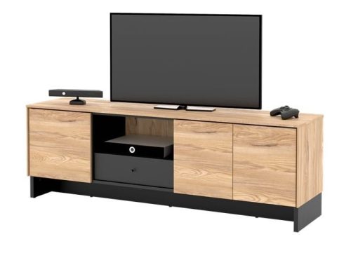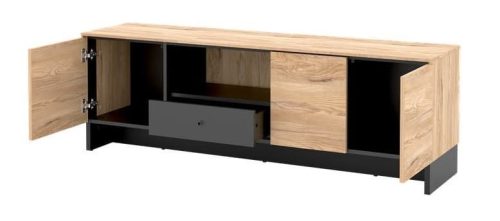 Barva: gorski pepel/črnaDimenzije: 1630x540x400 mm Trivratna TV komoda iz kolekcije Nomad je kos pohištva, ki bo vašemu domu dala popolnoma nov značaj. Optimalno dimenzionirana mizna plošča je prilagojena velikosti sodobnih televizorjev. V globoki vdolbini lahko priročno pospravite svojo multimedijsko opremo, v prostoren predal pa lahko skrijete daljinske upravljalnike, zbirko CD-jev in druge pripomočke. Nomad je kolekcija, ustvarjena za ljubitelje minimalističnega dizajna in nestandardnih rešitev. Sodoben značaj ima kombinacija gornika, črne in grafitne protisolne zasteklitve. Dobro organiziran prostor za sprostitev vpliva na celoten videz in vzdušje prostora, čisto in urejeno okolje pa spodbuja sprostitev in mir. | Material: Iveral in MDF