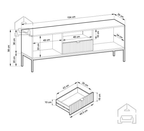 • Praktičnost: Komoda nudi dovolj prostora za shranjevanje vaših multimedijskih naprav, knjig ali dekorativnih predmetov, kar prispeva k urejenosti vašega bivalnega prostora.