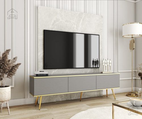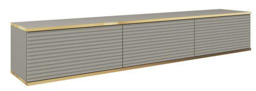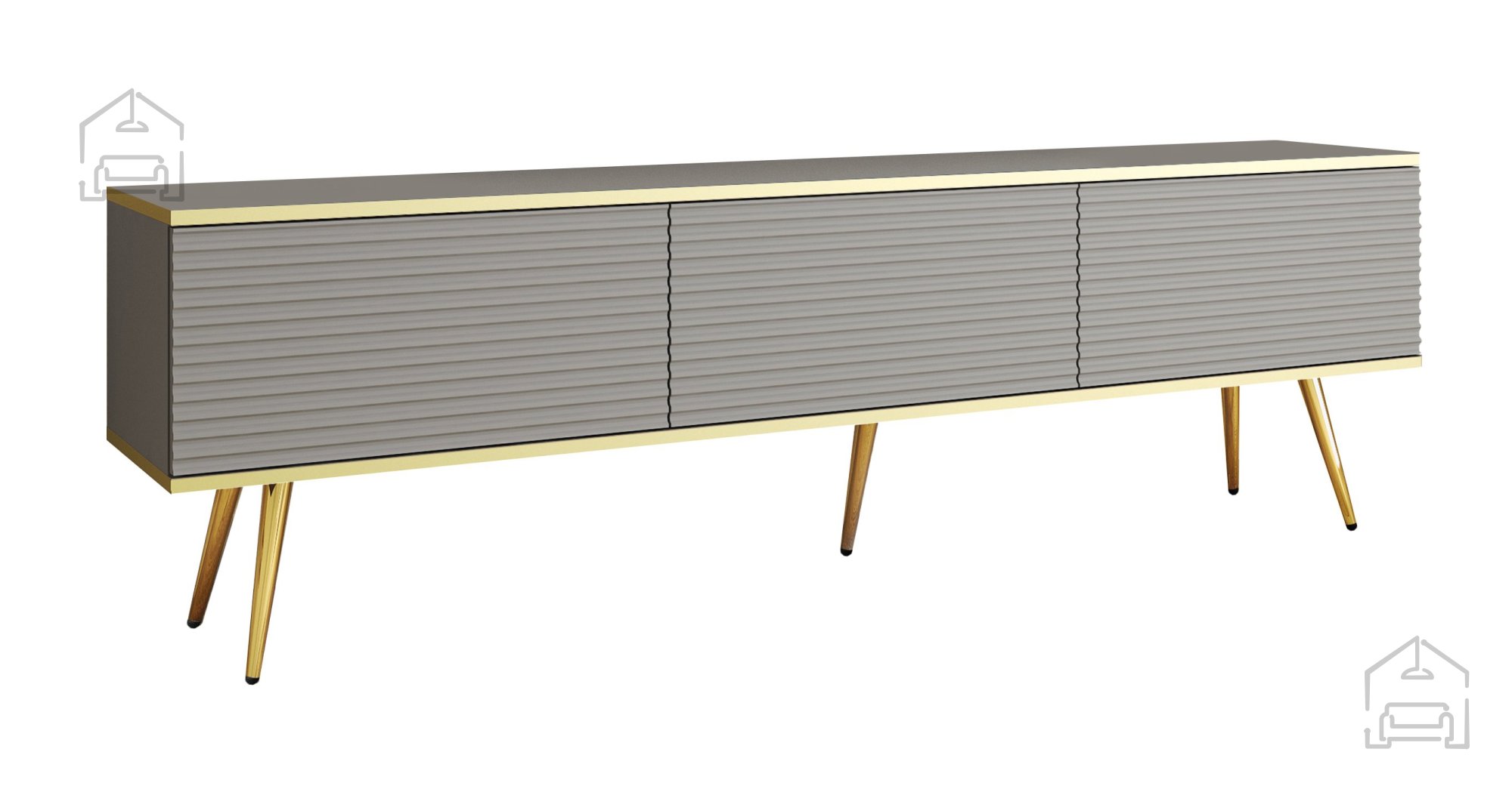 Dimenzije: 1750x300x320 mm RTV komoda Oro RTV-175 MDF bo poskrbela za barvni pridih, ki bo popestril vaš domači dekor. Zaradi trdne konstrukcije je RTV komoda zelo vzdržljiva. Fronte komode ima horizontalne letvice (na voljo v štirih različnih barvah) ali gladke površine (na voljo v petih različnih barvah). Horizontalna oblika RTV komode je poudarjena z uporabo zlatih letvic. | Material: Iveral in MDF